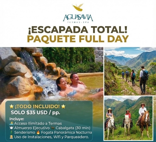 Disfruta un día completo en Aguasavia con acceso ilimitado a termas, almuerzo ejecutivo, cabalgata de 30 minutos, senderismo y fogata panorámica nocturna. Incluye uso de instalaciones, wifi y parqueadero. Un plan perfecto para relajarte, explorar y desconectar en un solo paquete.